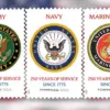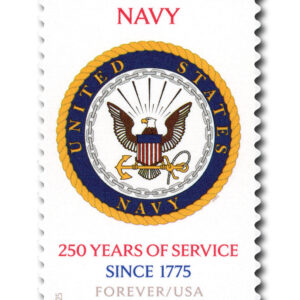 About the stamp design: Art director Antonio Alcalá designed the set of stamps. The emblem of each of the three military branches is featured against a white background. The phrases “250 YEARS OF SERVICE” and “SINCE 1775” are on each stamp.