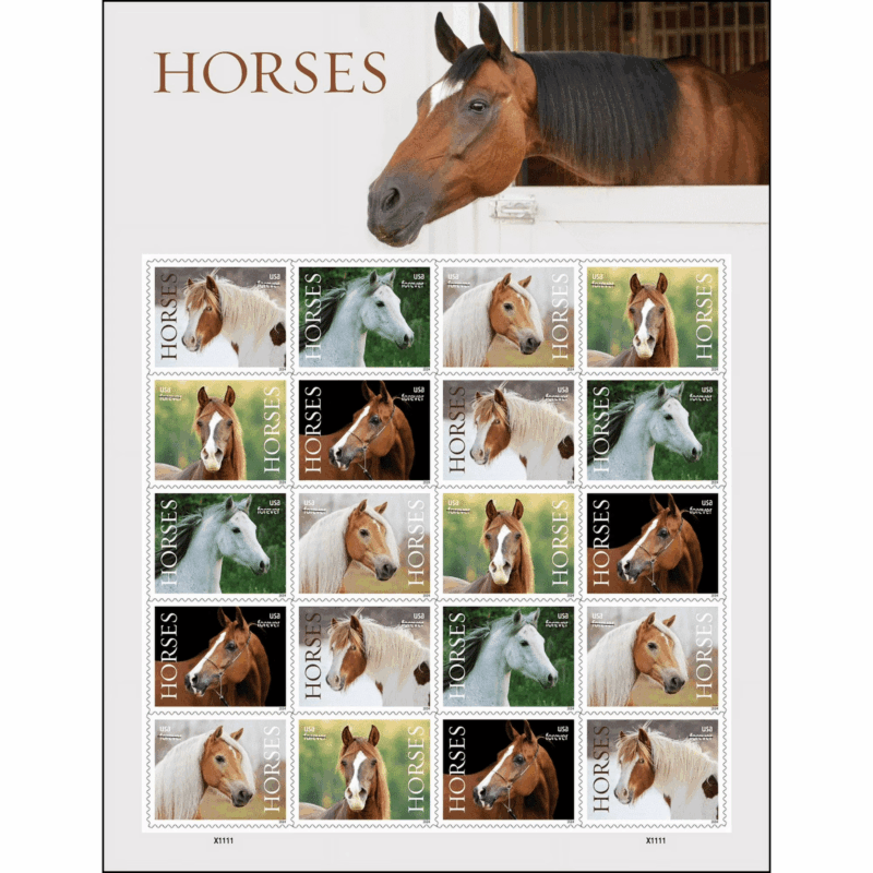 100 USPS Postage Stamps Horses. These stamps will always be equal in value to the current domestic one-ounce letter postage price. These self-adhesive stamps are being issued in Sheets of 20.
